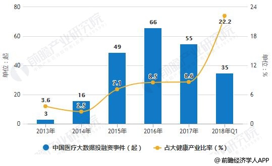 2013-2018年Q1中國(guó)醫(yī)療大數(shù)據(jù)投融資事件及占大健康產(chǎn)業(yè)比率統(tǒng)計(jì)情況