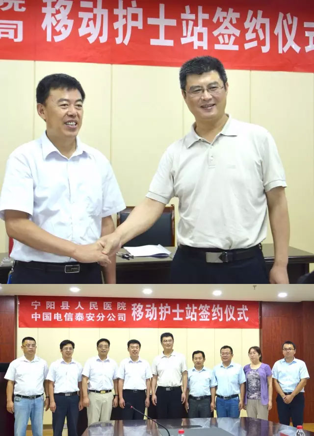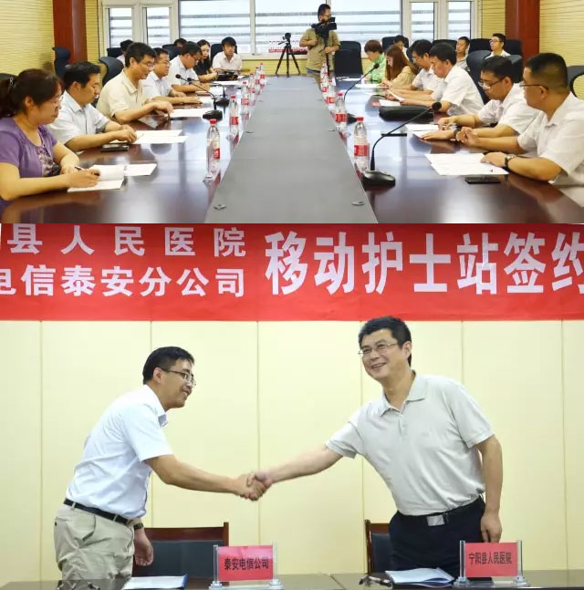 7月18日上午,寧陽縣人民醫(yī)院移動護(hù)士站簽約和交付儀式,在四樓會議室隆重舉行。泰安電信公司總經(jīng)理侯啟敬、政企部主任杜永健,寧陽電信公司總經(jīng)理劉偉、副總經(jīng)理李波、工程師楊旭(天坦軟件),寧陽縣人民醫(yī)院院長李連溪、副院長查賢強(qiáng)、張茂桐出席了簽約儀式;泰安電視臺、泰安廣播電臺、泰安大眾網(wǎng)等媒體進(jìn)行了全程報道。